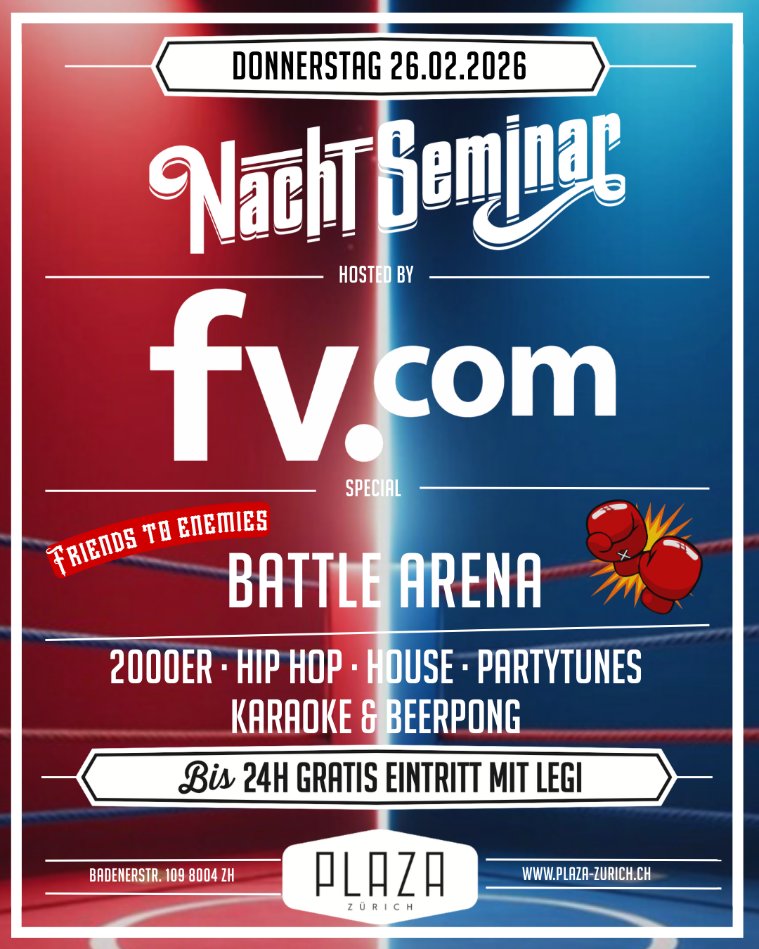Nachdem tagsüber Formeln gebüffelt, Bücher gewälzt, diverse Vorträge gehalten wurden und die Köpfe geraucht haben, kommt unser Nachtseminar wie gerufen. Das Plaza bietet die ideale Plattform, sich nach der Uni in gepflegtem Rahmen zu treffen und auszutauschen. Die ordentliche Festerei kommt dabei nicht zu kurz. Faire Preise an der Bar und das Hosting von verschiedenen führenden Studentenverbänden der Universität und ETH Zürich sorgen dafür, dass sich Studenten und auch solche, die es nicht sind, näher kommen. Und die verschiedenen Specials wie Glücksrad, Beerpong, Photobooth und viele mehr bringen für jeden Besucher die ideale Unterhaltung.