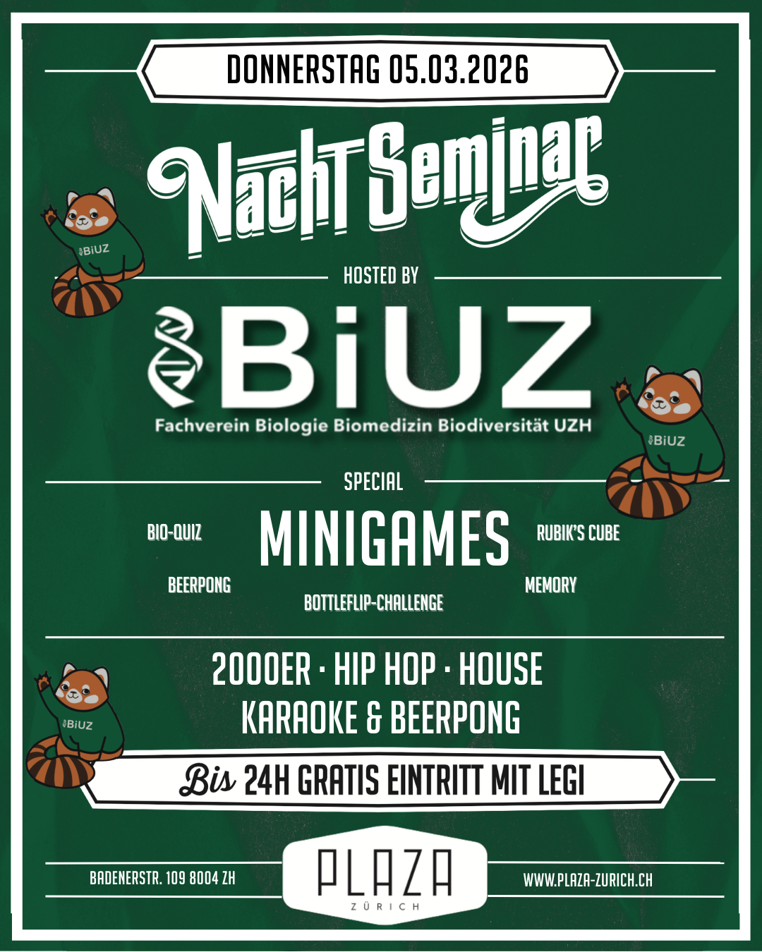 Nachdem tagsüber Formeln gebüffelt, Bücher gewälzt, diverse Vorträge gehalten wurden und die Köpfe geraucht haben, kommt unser Nachtseminar wie gerufen. Das Plaza bietet die ideale Plattform, sich nach der Uni in gepflegtem Rahmen zu treffen und auszutauschen. Die ordentliche Festerei kommt dabei nicht zu kurz. Faire Preise an der Bar und das Hosting von verschiedenen führenden Studentenverbänden der Universität und ETH Zürich sorgen dafür, dass sich Studenten und auch solche, die es nicht sind, näher kommen. Und die verschiedenen Specials wie Glücksrad, Beerpong, Photobooth und viele mehr bringen für jeden Besucher die ideale Unterhaltung.