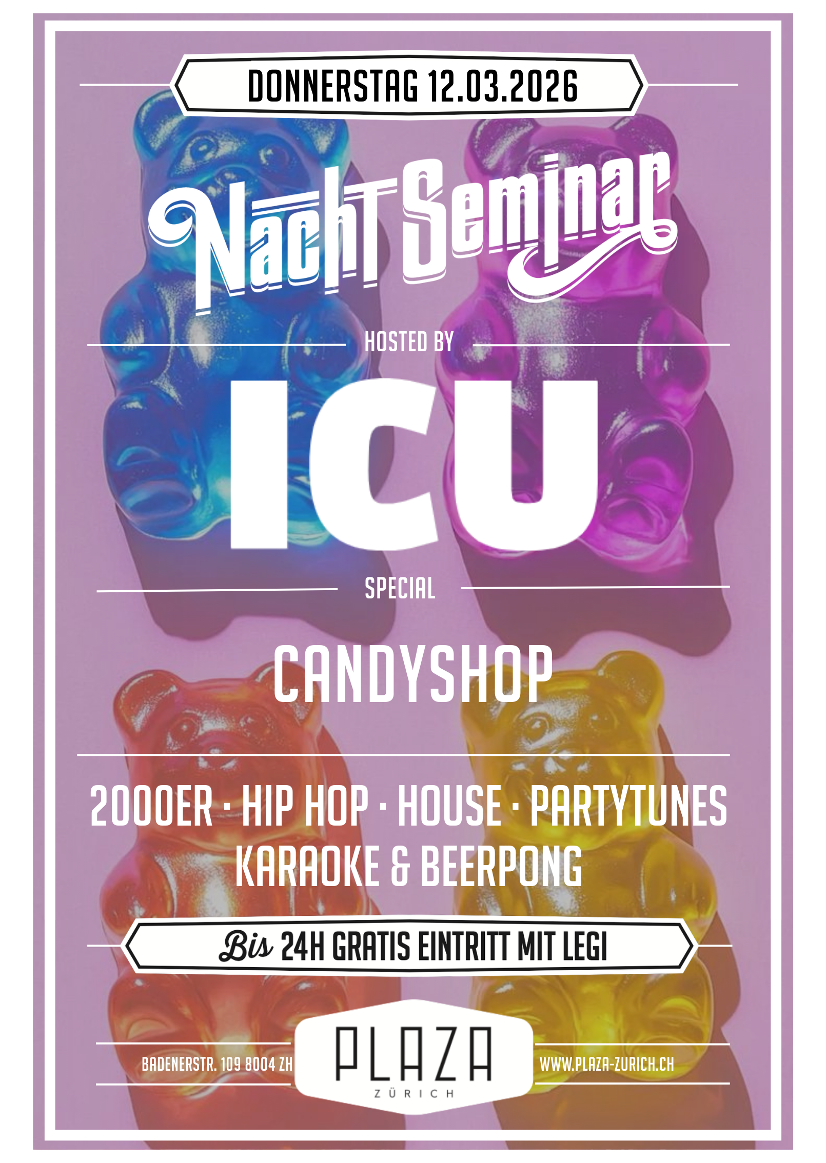 Nachdem tagsüber Formeln gebüffelt, Bücher gewälzt, diverse Vorträge gehalten wurden und die Köpfe geraucht haben, kommt unser Nachtseminar wie gerufen. Das Plaza bietet die ideale Plattform, sich nach der Uni in gepflegtem Rahmen zu treffen und auszutauschen. Die ordentliche Festerei kommt dabei nicht zu kurz. Faire Preise an der Bar und das Hosting von verschiedenen führenden Studentenverbänden der Universität und ETH Zürich sorgen dafür, dass sich Studenten und auch solche, die es nicht sind, näher kommen. Und die verschiedenen Specials wie Glücksrad, Beerpong, Photobooth und viele mehr bringen für jeden Besucher die ideale Unterhaltung.